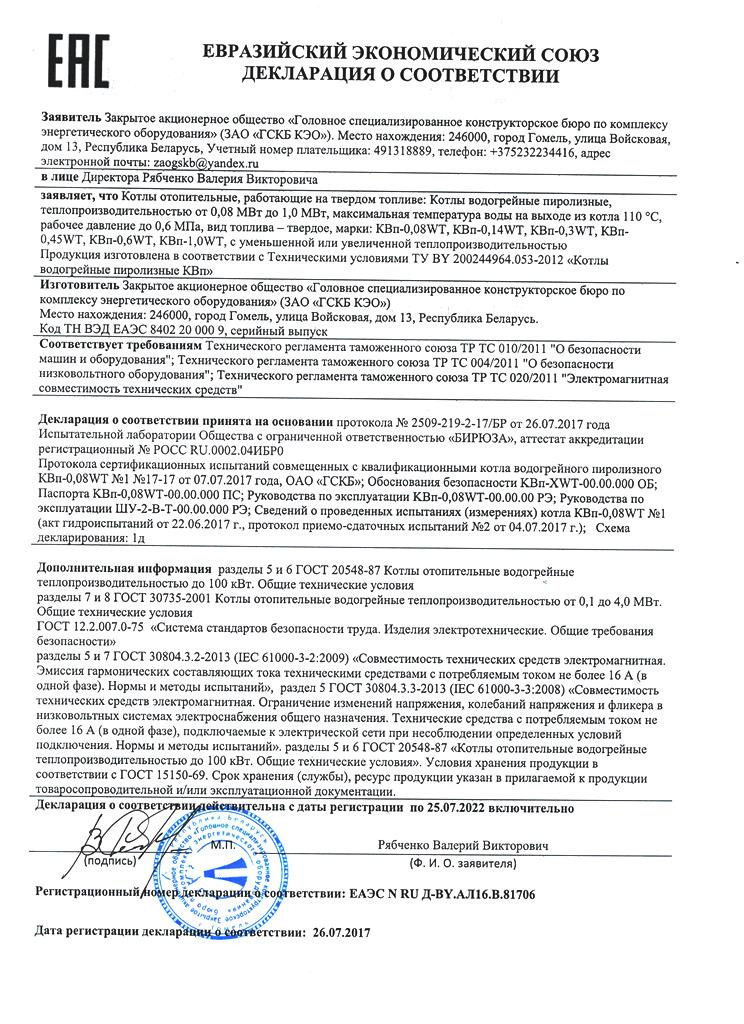 ЗАО «ГСКБ КЭО» гарантирует соответствие котолов водогрейных пиролизных КВп требованиям технической документации при соблюдении потребителем правил и условий хранения, транспортирования, монтажа, эксплуатации и технического обслуживания, установленных в руководстве по эксплуатации.